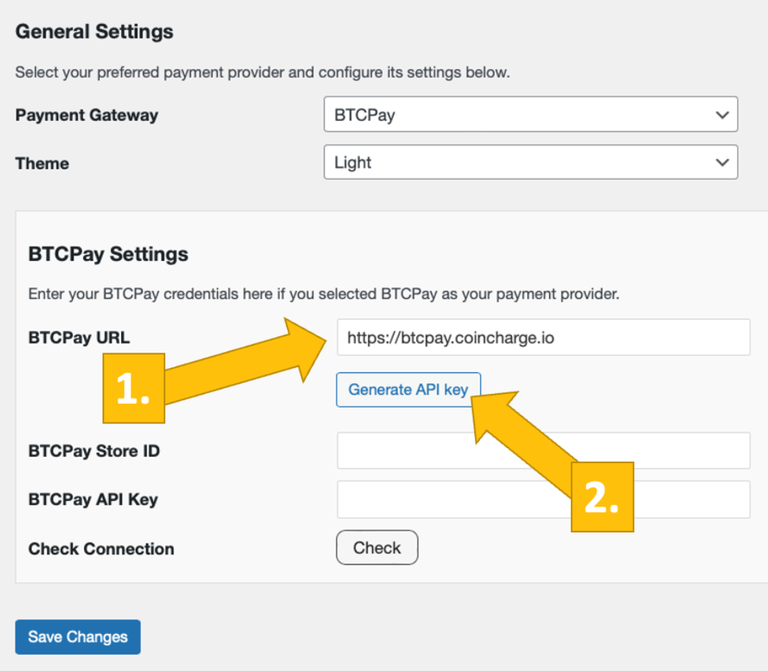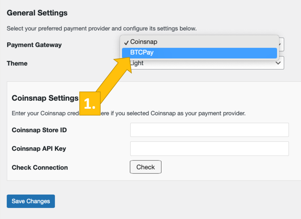 Now, log into your BTCPay Server. If you’ve done that, enter your BTCPay Server URL into the matching field in the Donation Settings tab [1].