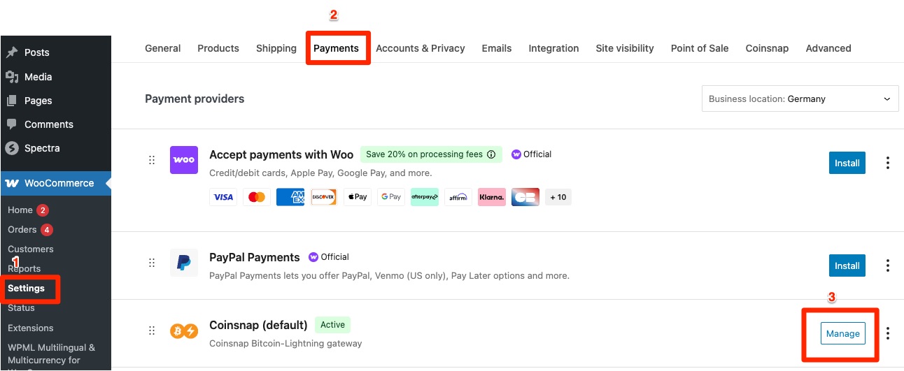 To enable Bitcoin payments, your WooCommerce store must be connected to your Coinsnap account.
