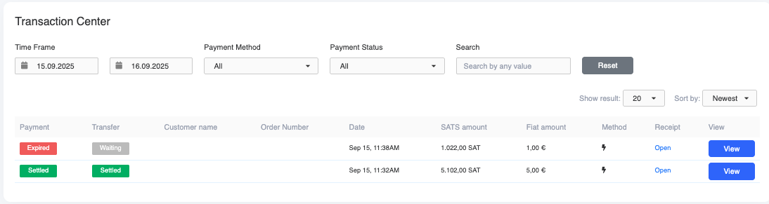 All transactions are listed in your Coinsnap Dashboard under Payments.
