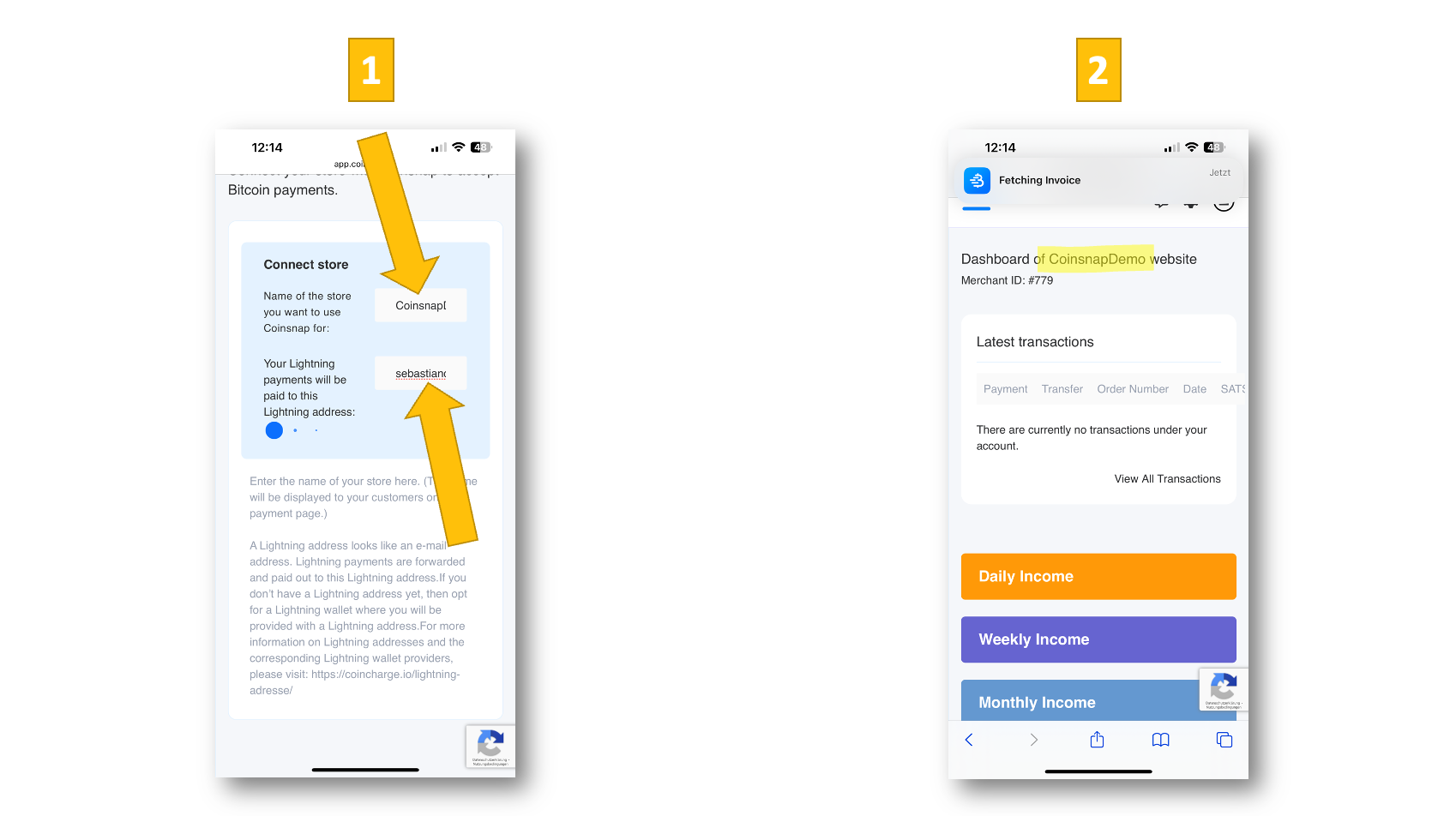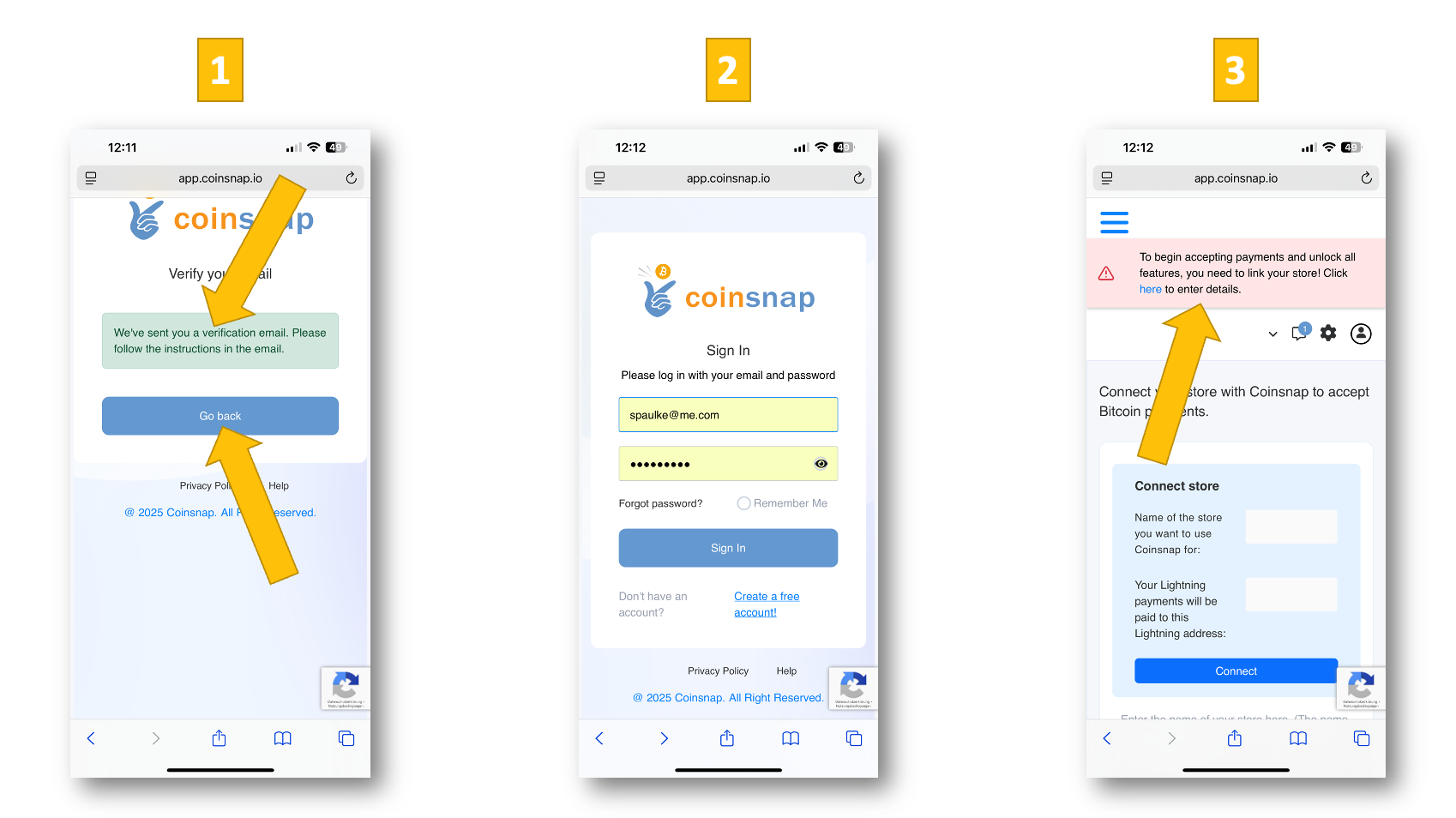 In your Coinsnap dashboard , you will now see the message that you need to connect your store and wallet to Coinsnap. [3]