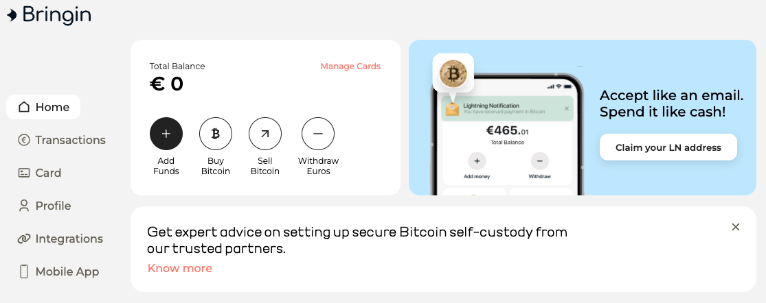 Bringin is a Bitcoin-to-Euro service that gives you a personal Lightning address and a IBAN (EU bank account in your name). When you plug that Lightning address into Coinsnap, every Lightning payment from your WooCommerce checkout is auto-converted to EUR in real time and credited to your IBAN—no technical setup beyond pasting the address.
