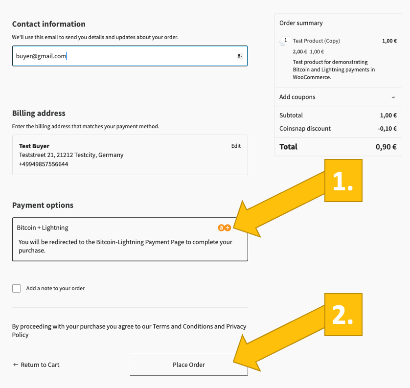 - Confirm the order status updates in WooCommerce and that Coinsnap shows the transaction details.
