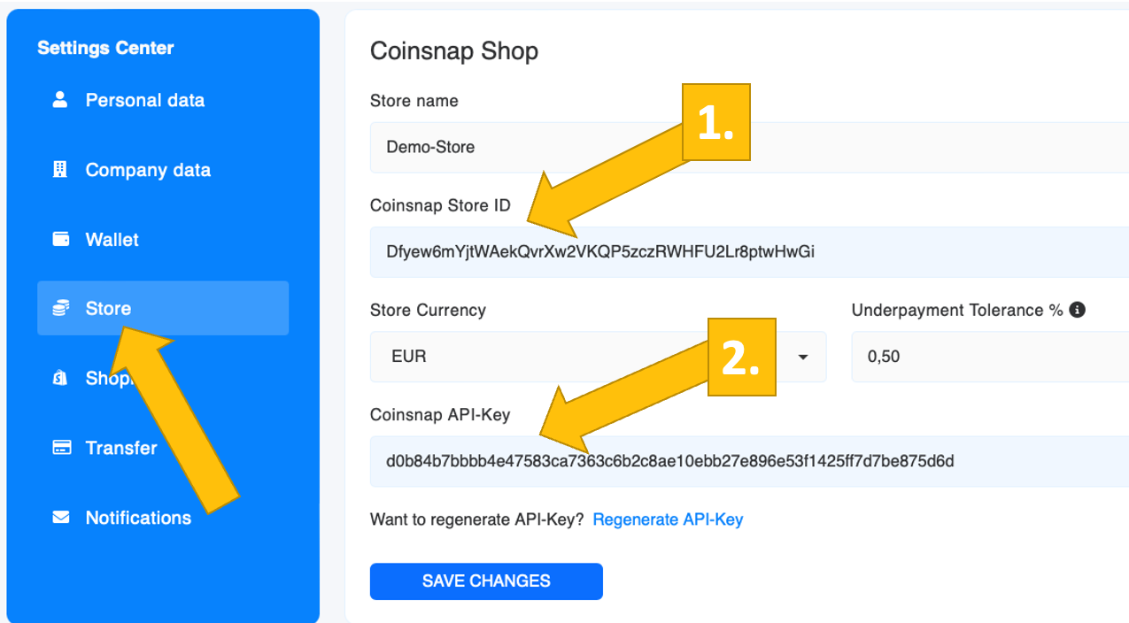 - Copy your Store ID and API Key (see second image) and paste these into the Coinsnap plugin.