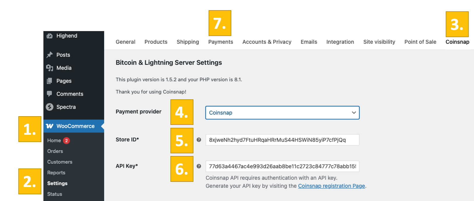 - Choose Coinsnap as your payment provider [4], and paste your Store ID [5] and API Key [6].
