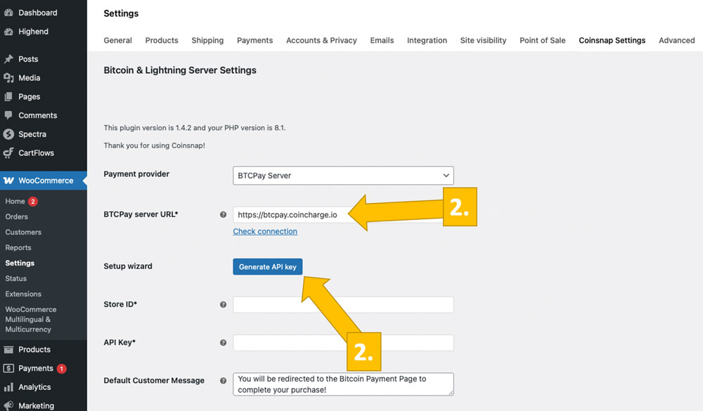 - In WordPress, go to WooCommerce [1] → Settings [2] → Coinsnap [3].