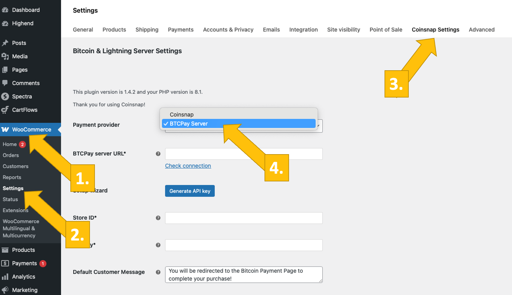 Then select the Coinsnap Settings [3] tab and select the BTCPay server as your payment provider [4].