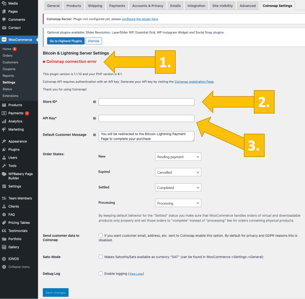 After clicking on the link provided or going to the Coinsnap settings tab, you will first see the message Coinsnap connection error [1] in red. This means that you must now enter your Coinsnap Store ID [2] and your Coinsnap API Key [3] in the two corresponding fields below.