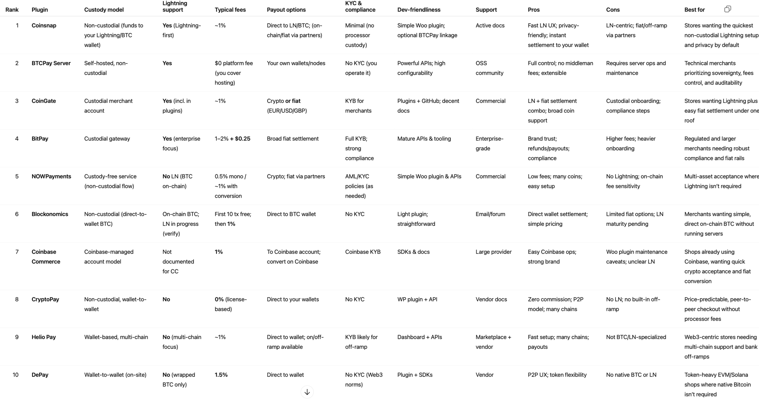Here is a decision matrix for the 10 best WooCommerce Bitcoin payment plugins: