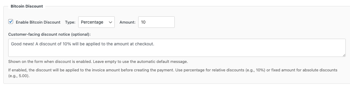 Activate the Bitcoin Discount feature to reward customers who pay with Bitcoin.