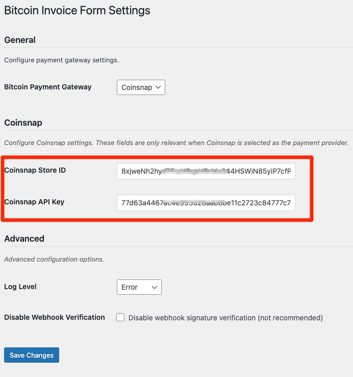 - Enter both in your WordPress plugin settings under Coinsnap.