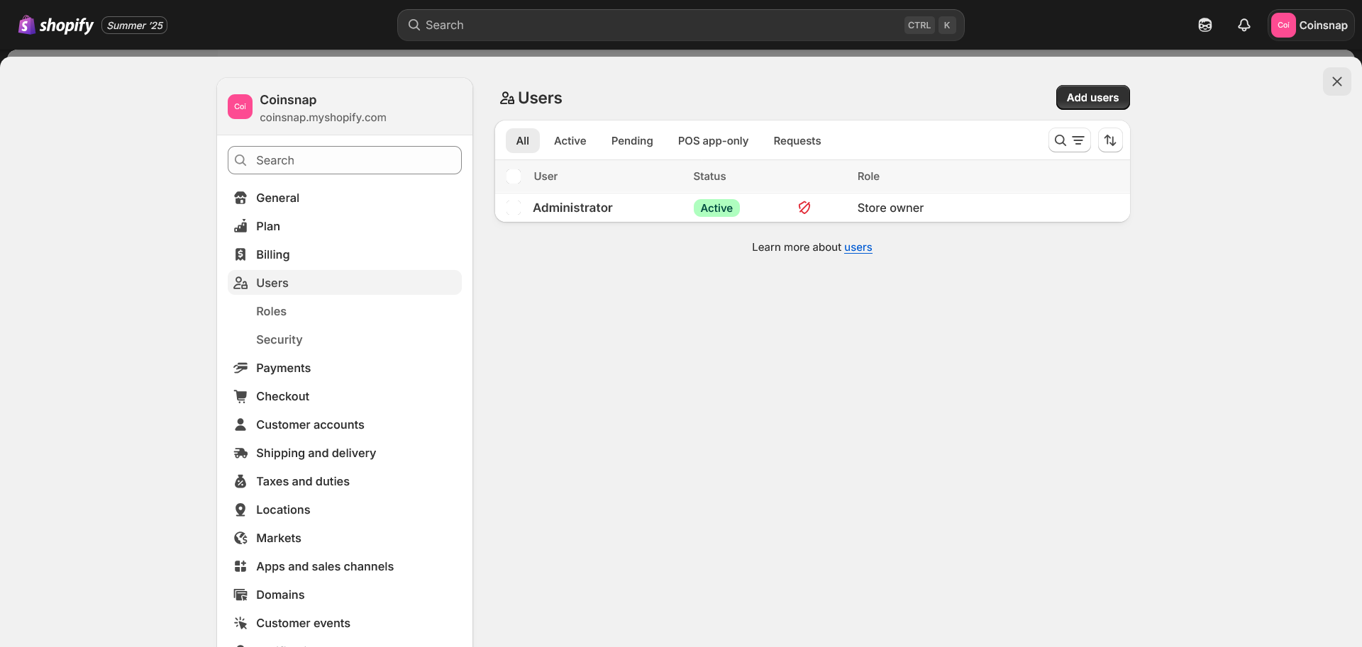 To receive Bitcoin in your Shopify store, you have to connect the Coinsnap for Shopify Bitcoin payment app with your Shopify store.