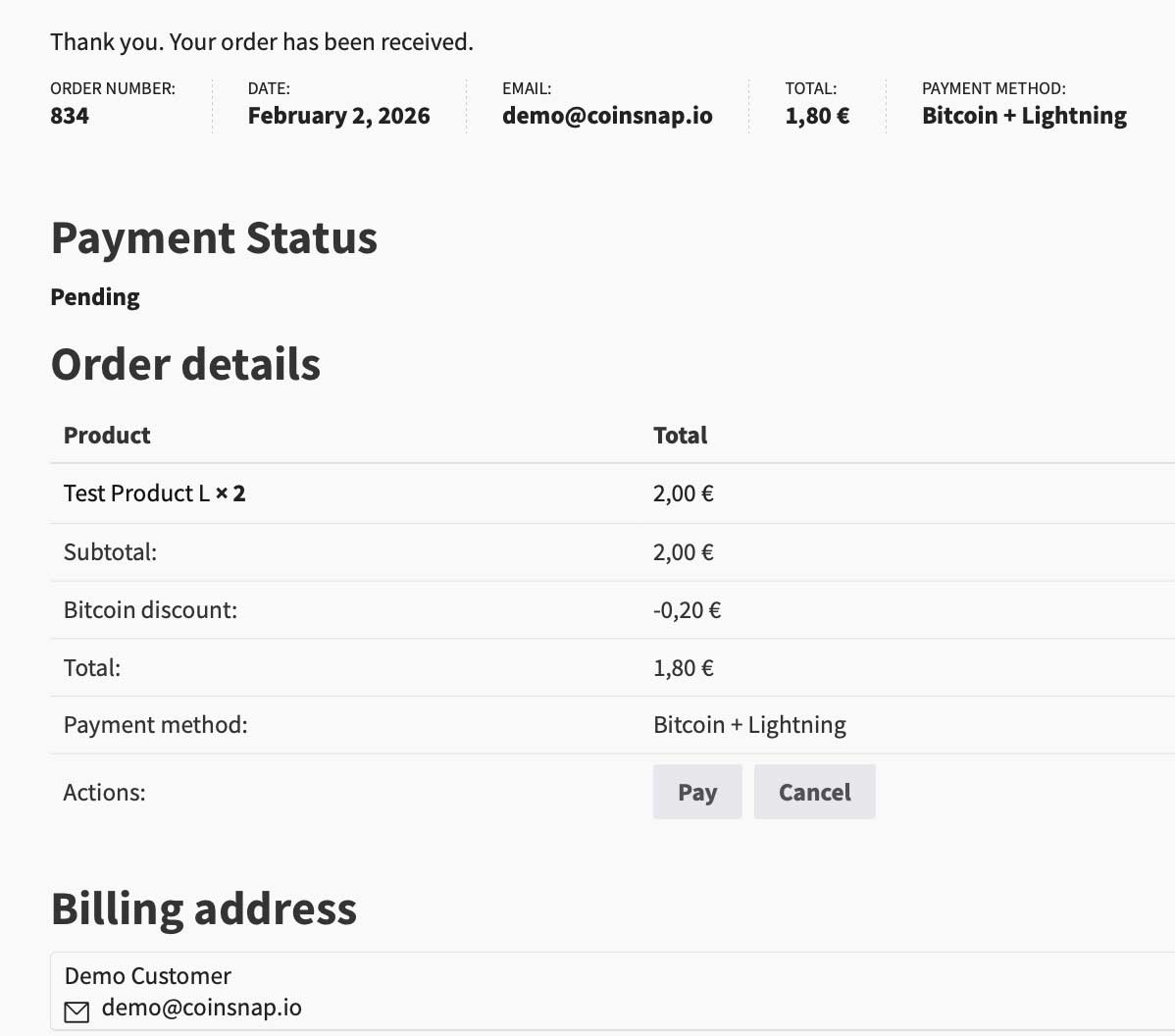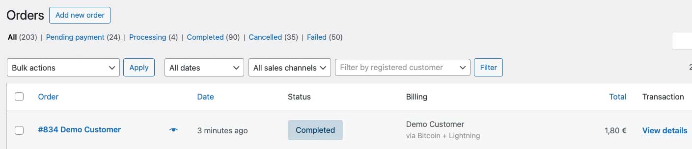 Since the Coinsnap plugin is fully integrated with WooCommerce, all customer and payment data is captured and available in your WooCommerce dashboard.