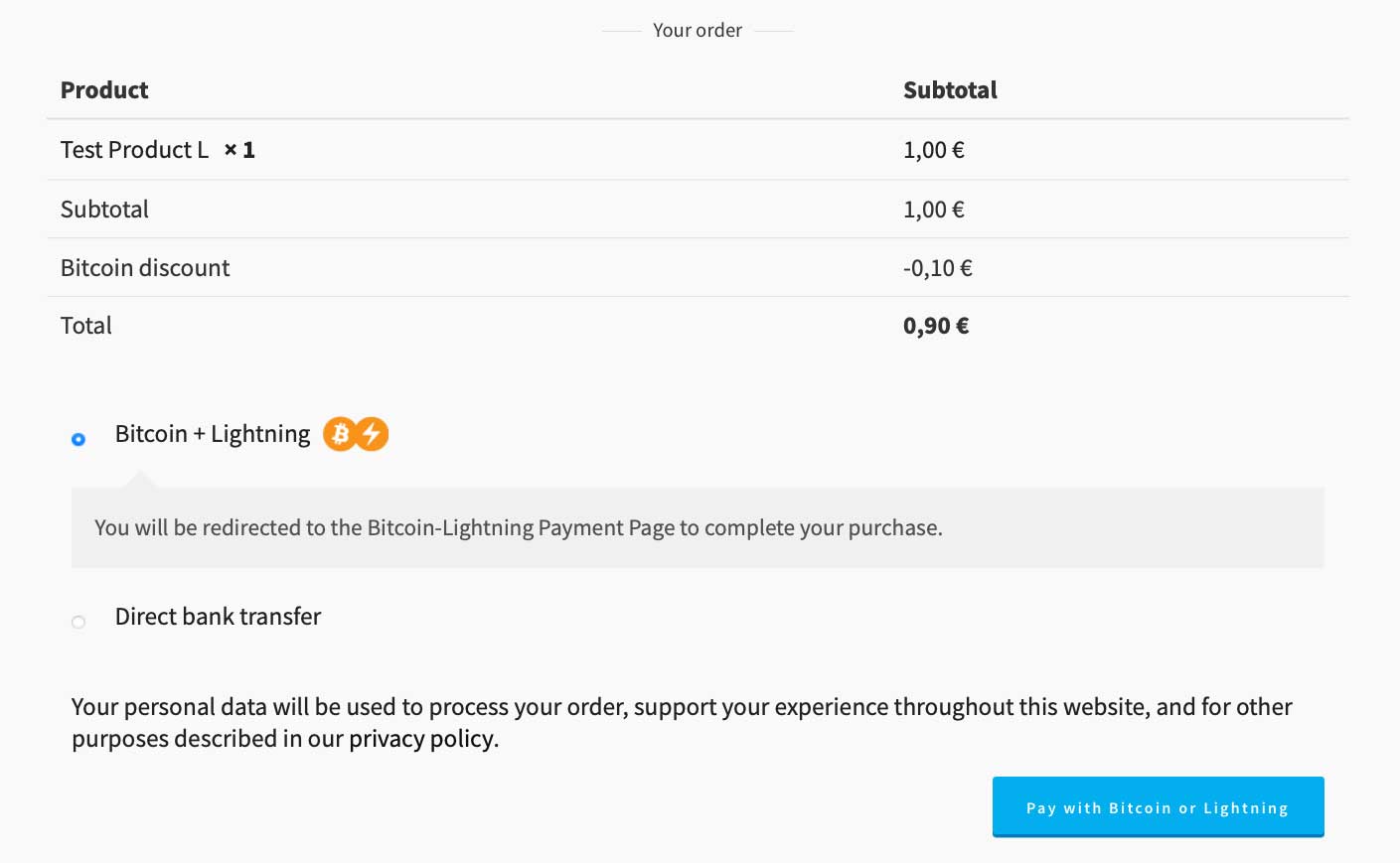 Place an order in your WooCommerce cart, proceed to checkout, and select Bitcoin Lightning Payment from the available payment options.