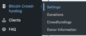 After you have installed and activated the Coinsnap Bitcoin Crowdfunding plugin, you need to configure the Coinsnap settings. Go to Bitcoin Crowdfunding -> Settings in the black sidebar on the left.