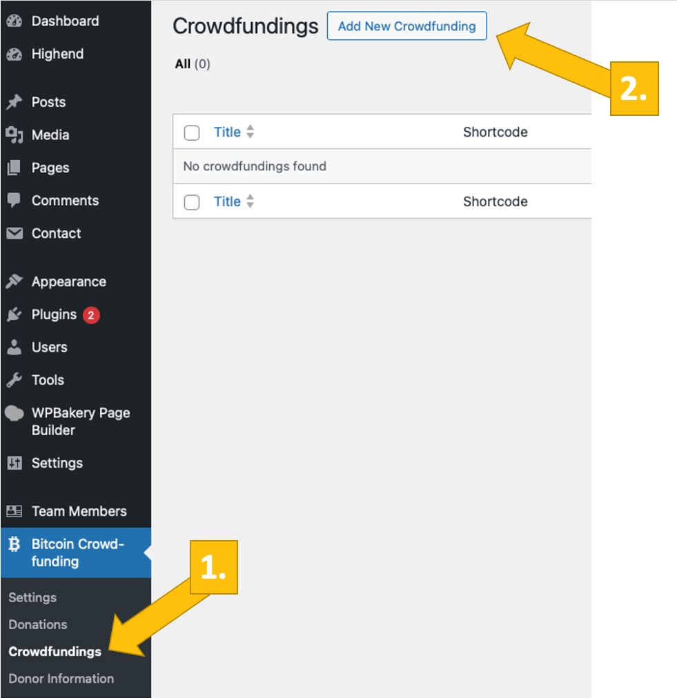 Go to Bitcoin Crowdfunding -> Crowdfundings [1] in the left sidebar. Then click on Add New Crowdfunding on the top [2]