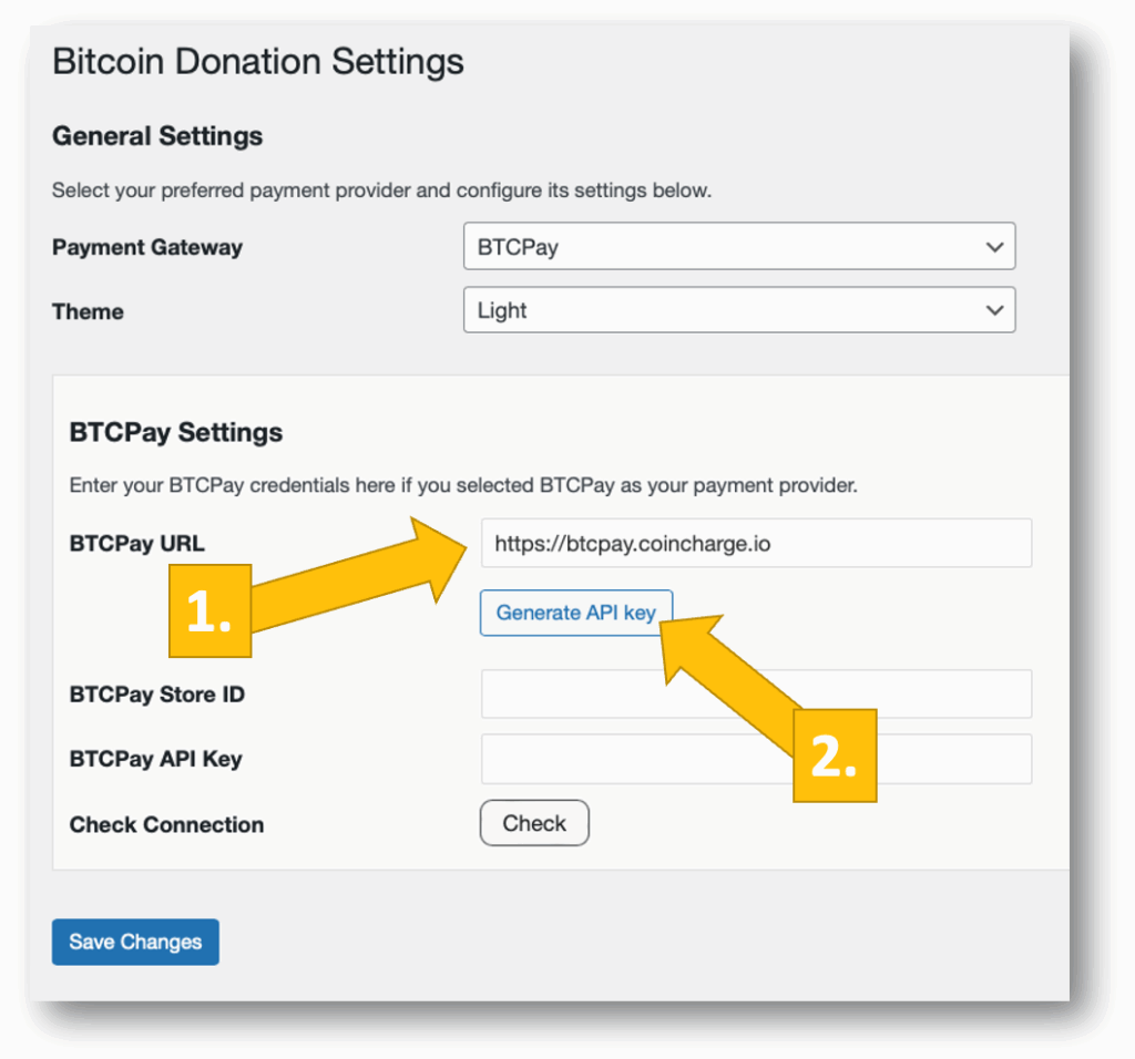 Now, log into your BTCPay Server. If you’ve done that, enter your BTCPay Server URL into the matching field in the Donation Settings tab [1].