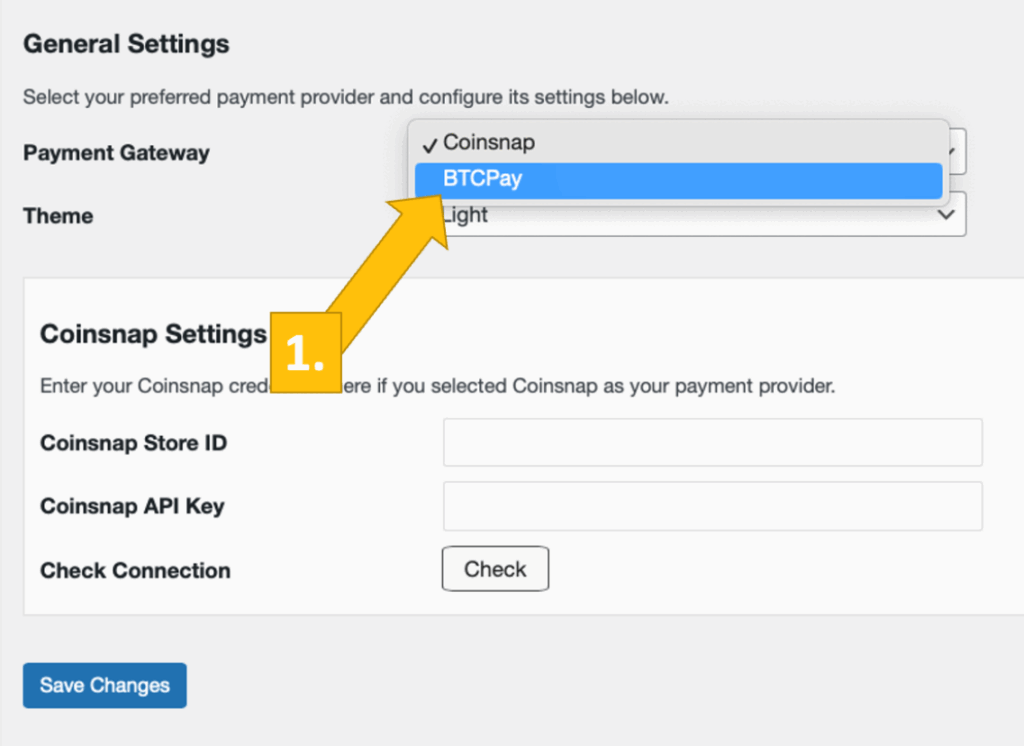 Now choose your payment gateway Coinsnap [1]. (You can also choose BTCPay server if you are using one, and then fill in the respective information.)