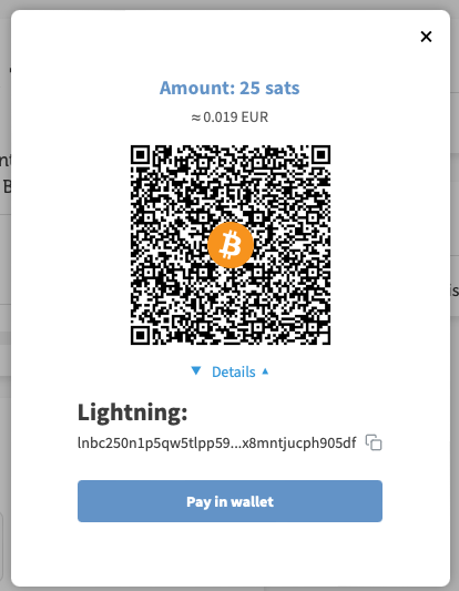 The Bitcoin payment page is now displayed and offers the payer the option of paying with Bitcoin or Lightning.