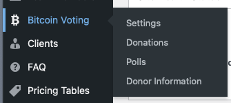 After you have installed and activated the Coinsnap Bitcoin Voting plugin, you need to configure the Coinsnap settings. Go to Bitcoin Voting [1] -> Settings [2] in the black sidebar on the left.