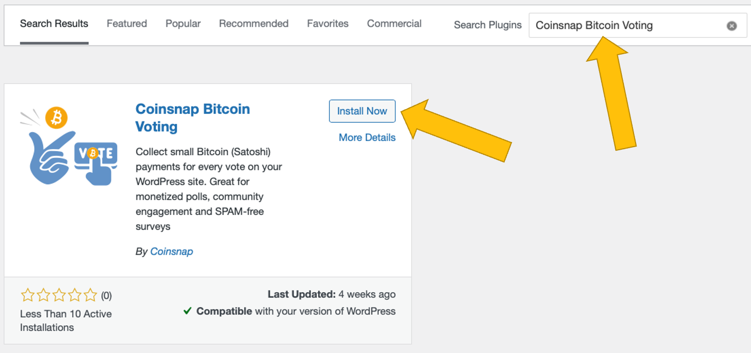 When shown the Coinsnap Bitcoin Voting plugin, click on Install now, then on Activate.