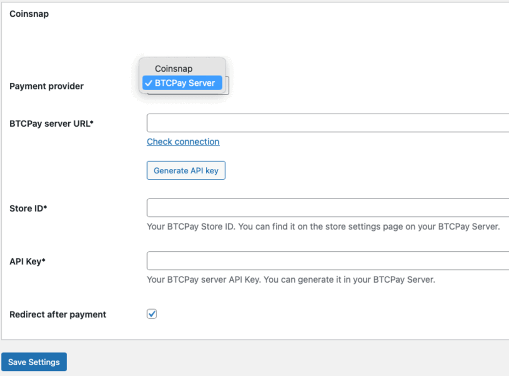 Coinsnap for Ninja Forms BTCPay Server Settings