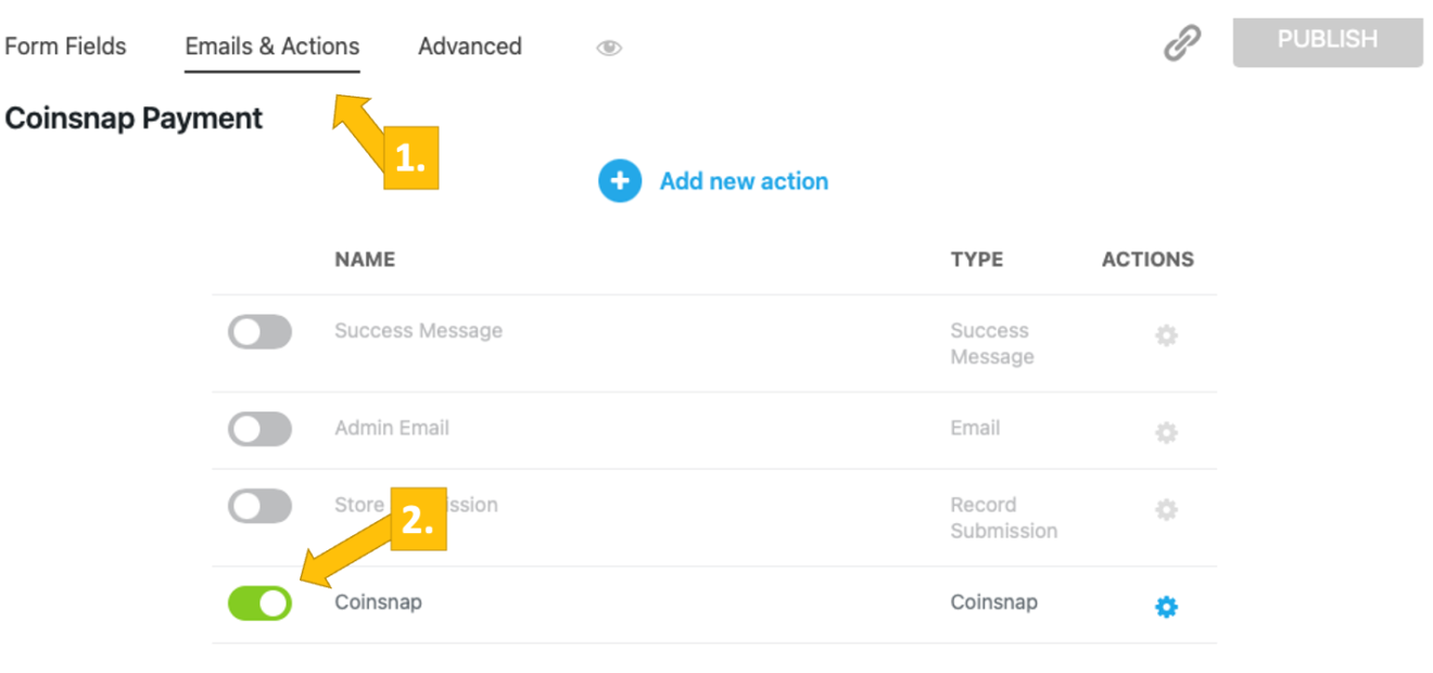 It is actually very simple to accept Bitcoin payment with Coinsnap for Ninja Forms. Just edit the form you want to use to accept Bitcoin, and click on the Emails & Actions tab on the tab [1]. Then enable Coinsnap [2] and your form will offer Bitcoin payment when it is submitted!