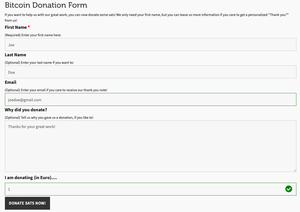 Fill out a Ninja Forms form you have just created and click on the black PAY WITH SATS button to initiate the Bitcoin payment.