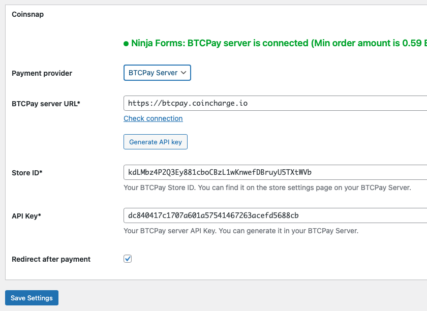 Your BTCPay Server is now successfully connected to your Ninja Forms, via the Coinsnap for Ninja Forms plugin!