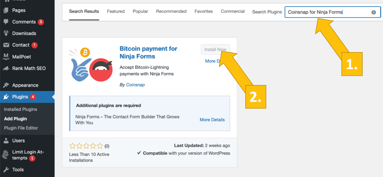 Enter Coinsnap for Ninja Forms in the search bar [1] and click on Install now [2], then Activate the plugin.