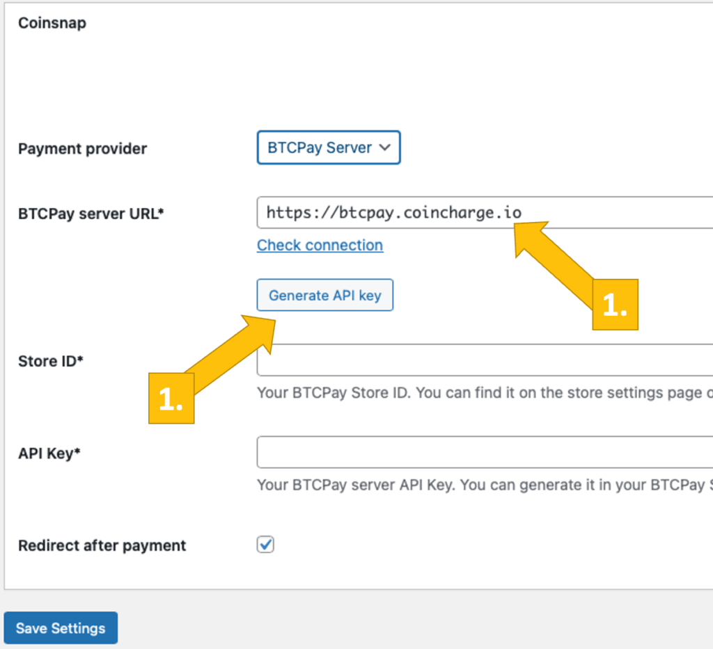 There, just enter your Coinsnap Store ID [3] and your Coinsnap API Key [4] into the respective two fields, and click on save settings on the bottom of the window.
