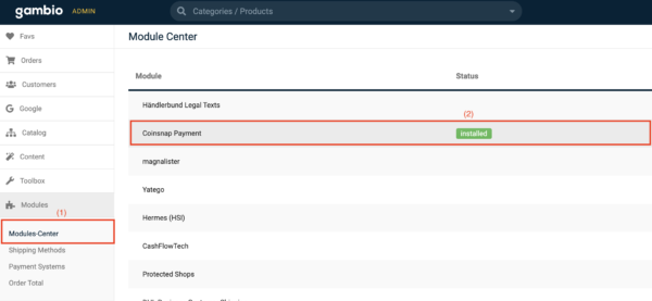 Navigate to “Modules” -> “Module Centre” -> “Coinsnap Payment” and click on “Edit” again.