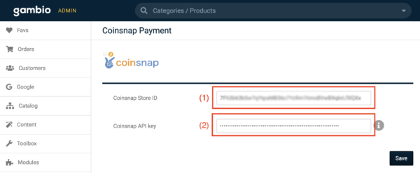 After you have saved the data, your Gambio shop is successfully connected to the Coinsnap app.