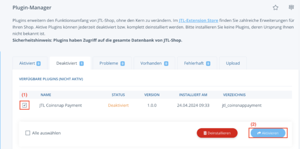 After you have installed our plugin, it will be deactivated by default. Go to the “Deactivated” section and select JTL Coinsnap Payment.