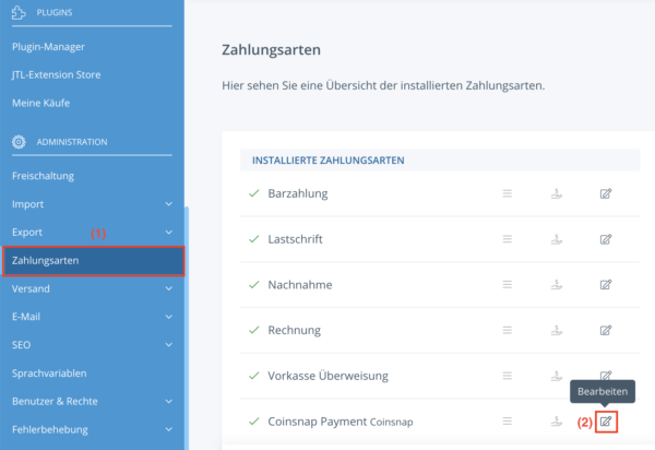 Select “Coinsnap Payment” and click on the “Edit” button – the small pencil that is the last in the row.