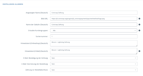 First, you can make the general settings that you will have in your Coinsnap payment method.