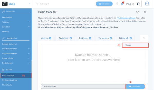 Select the upload tab, which will be the last one on the right side. After you have selected “Upload-tab”, (3) drag the .zip file that you downloaded from our github page Coinsnap for JTL-Store Plugin onto the page.