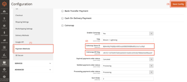 Enter the store ID and API key that you copied from the Coinsnap app into the corresponding fields.