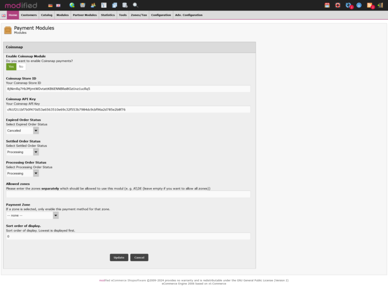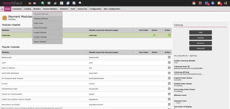 Log in to Modified Shop as an admin. Navigate to Modules – Payment methods, search for Coinsnap and click on Install – after the installation Coinsnap will appear in the list of installed modules Now you can proceed with the setup of your Coinsnap plugin as described below. After the Coinsnap for Modified Shop plugin has been installed and activated, the plugin still needs to be configured. You can learn how to do this here.