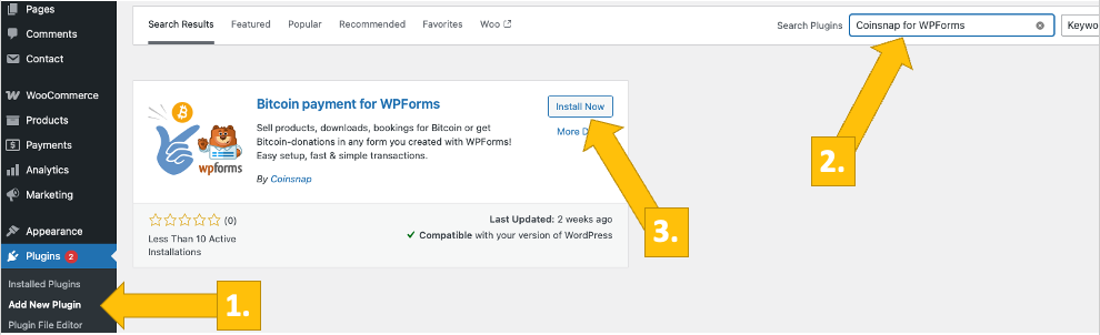(2) Enter “Coinsnap for WPForms” in the search bar and click on “Install”.