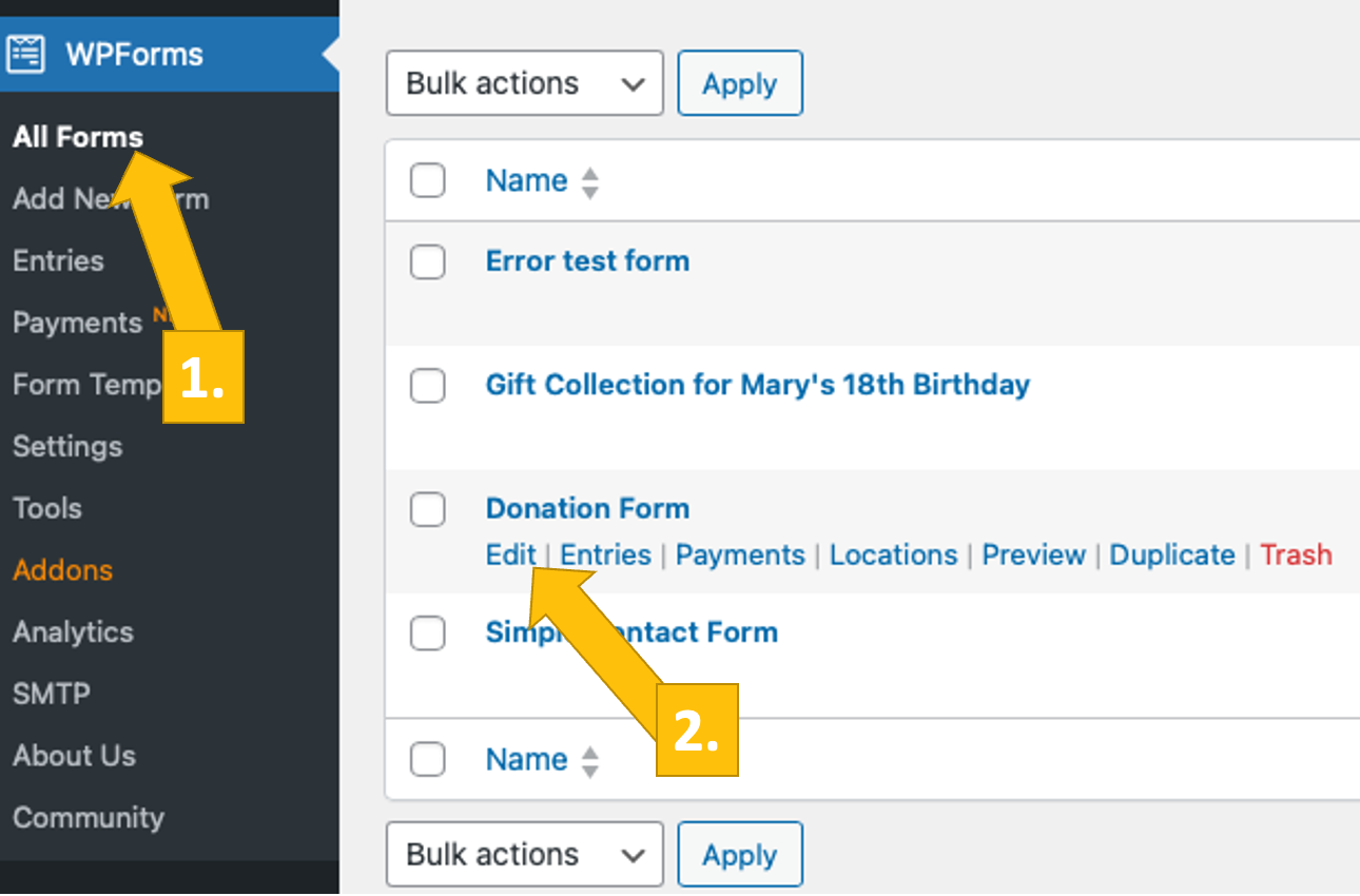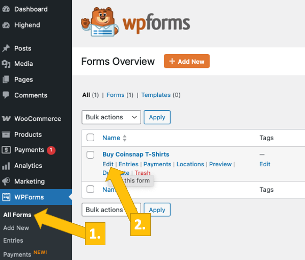 Go to WPForms in your left sidebar, click on All Forms [1] and choose the form for which you want to enable Bitcoin payment (edit) [2].
