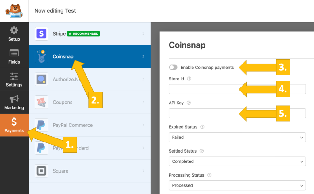 After you have installed and activated the Coinsnap for WPForms plugin, you need to configure the Coinsnap settings.