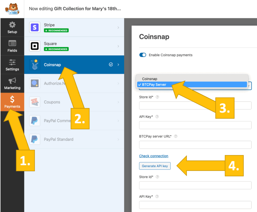 In your form, go to Payments [1], then click on Coinsnap [2], and choose the BTCPay Server [3]. Now, log into your BTCPay Server, come back to the WPForm, and click on Generate API Key [4].